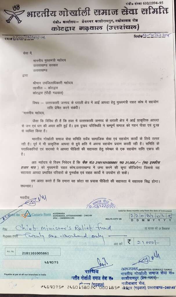 कोटद्वार। भारतीय गोरखाली समाज सेवा समिति कोटद्वार ने उत्तरकाशी जनपद के धराली एवं हर्षिल क्षेत्र में आई आपदा के राहत कार्यों के लिए मुख्यमंत्री राहत कोष में चैक द्वारा 21 हजार रुपये की धनराशि का योगदान दिया है।