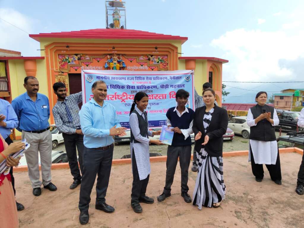 पौड़ी। अंतर्राष्ट्रीय साक्षरता दिवस के अवसर पर जिला विधिक सेवा प्राधिकरण पौड़ी द्वारा विधिक साक्षरता एवं जागरूकता शिविर का आयोजन किया गया। शिविर की शुरुआत एजेंसी चौक से रामलीला मैदान तक रैली के आयोजन से हुई। जिसमें स्कूली छात्र -छात्राओं ने न्याय और शिक्षा दोनों हमारे अधिकार जैसे उदघोष के माध्यम से आमजन को जागरुक किया। रैली के उपरांत एक बच्चा, एक किताब अभियान के तहत विद्यार्थियों को पुस्तकें भी वितरित की गयी।